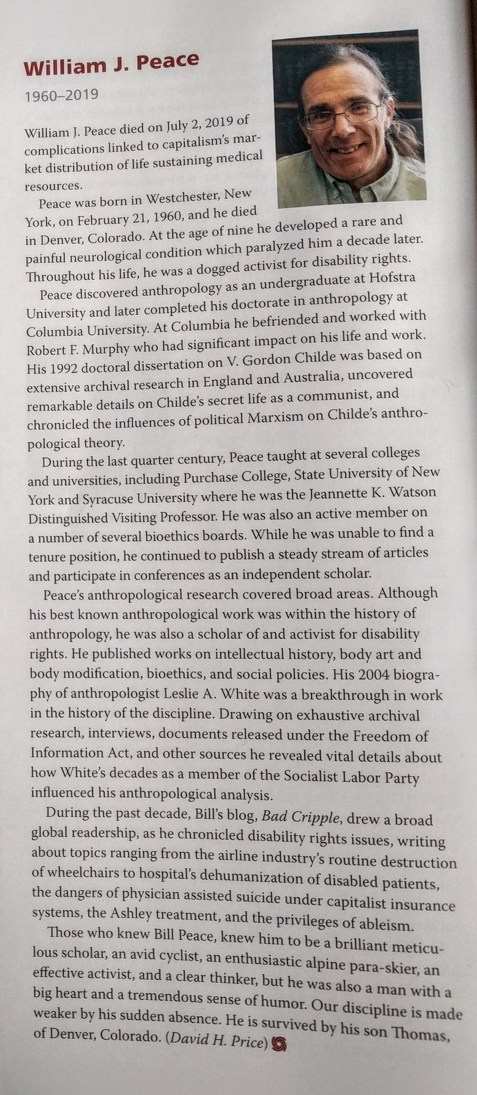 2019 “In Memoriam, William J. Peace, 1960 - 2019” Anthropology News November/December 2019, p48.