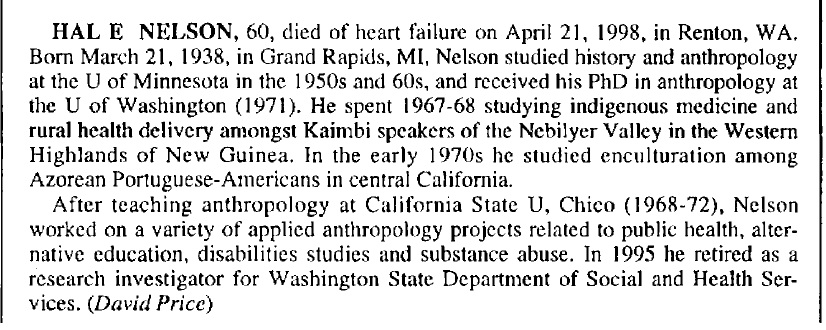 1998 “Obituary for Hal E. Nelson.” Anthropology Newsletter 39(7):24.