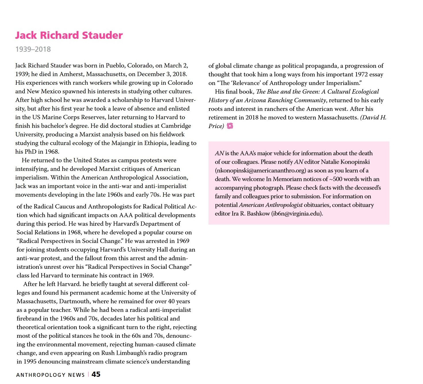 2023 “In Memoriam, Jack Richard Stauder, 1939 – 2018.” Anthropology News. 64 (2):45-46.