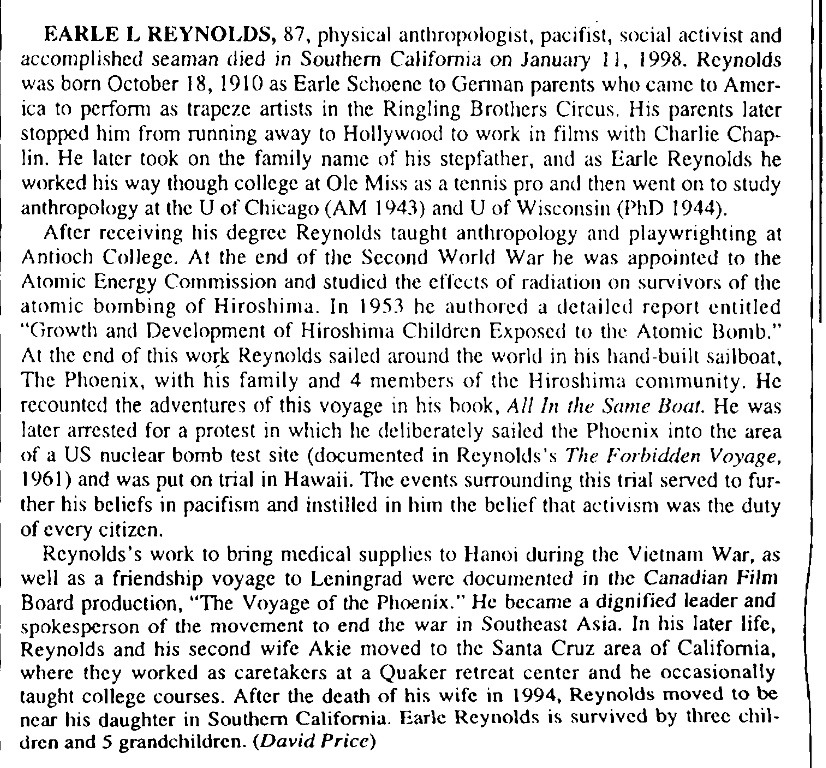 1998 “Obituary for Earle L. Reynolds.” Anthropology Newsletter 39(6):29.
